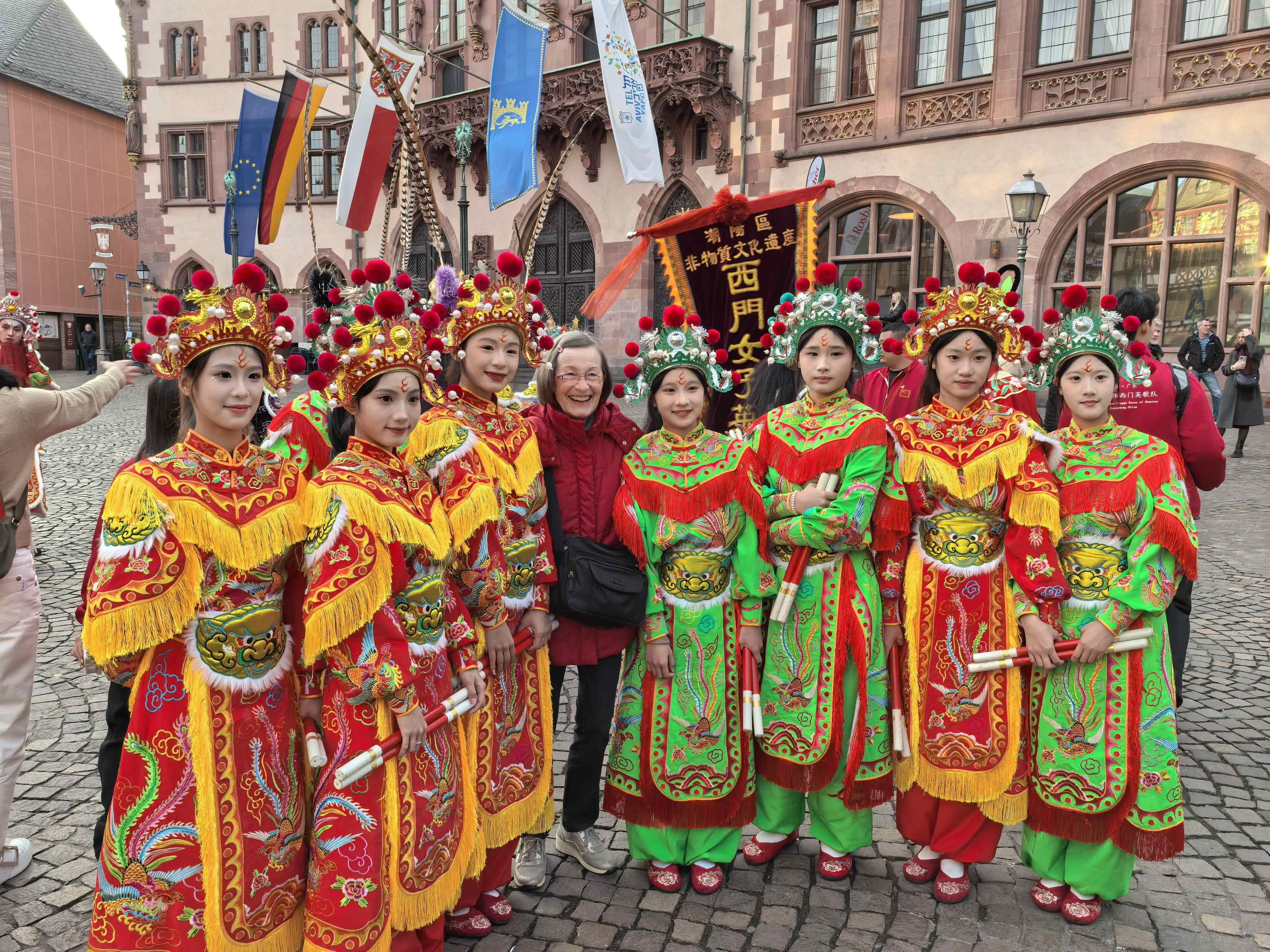 法兰克福市中心卫戍广场(Hauptwache)人头攒动,来自广东汕头潮阳的西门英歌队带来英武大气的英歌开场表演,拉开此次春节庙会的序幕。