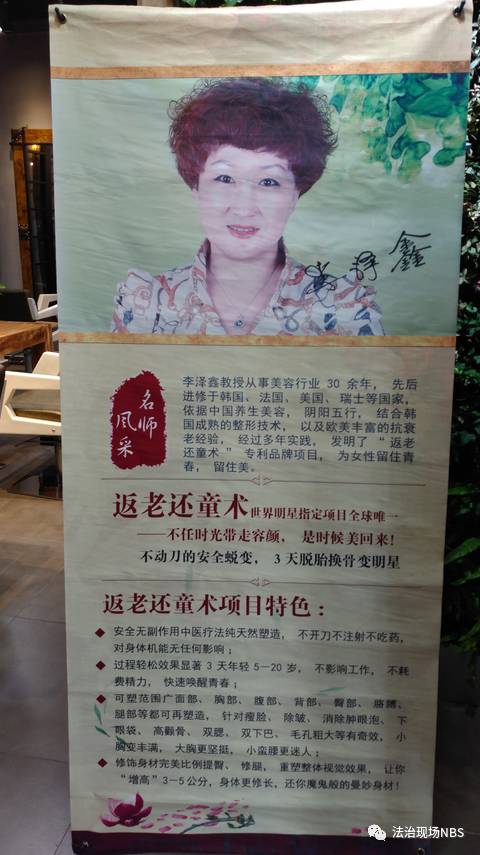 这份宣传广告上写着,李泽鑫的教授依据中国养生美容、阴阳五行,结合韩国成熟的整形技术以及欧美丰富的抗衰老经验,经过多年实验发明了“返老还童术”专利品牌项目,声称不开刀不注射不吃药,3天年轻5-20岁。