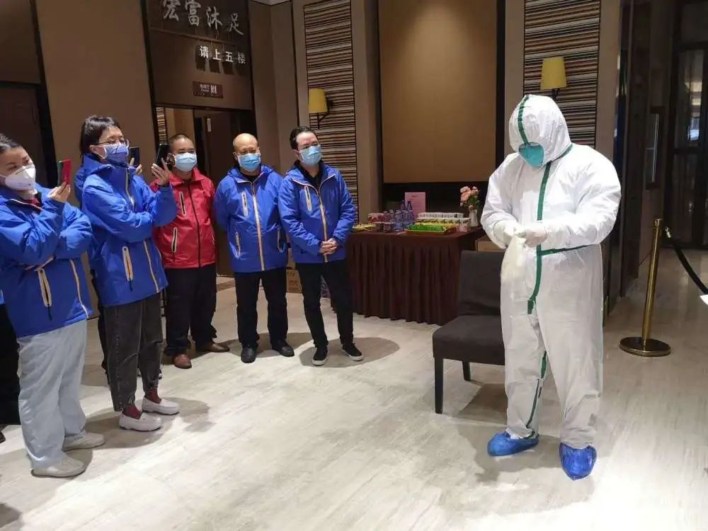 图为四川大学华西医院援湖北医疗队朱仕超(右二)与同事相互鼓励打气。