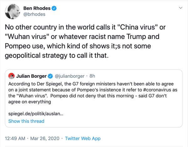 前美国国家安全副助理本·罗德斯:世界上没有任何国家将其称为“中国病毒”或“武汉病毒”,或使用特朗普和蓬佩奥的任何带有种族主义色彩的名称。从某种程度上表明,这不是什么地缘政治策略。