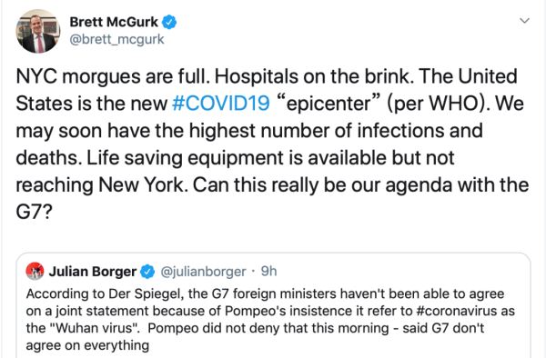 前美国副助理国务卿布雷特·麦格克:纽约市的停尸房已满,医院面临崩溃。据世卫组织称,美国是疫情新“震中”。美国的感染人数和死亡人数可能很快就会达到最高,救生设备却还没有送达纽约。给病毒命名这事居然可以成为G7的议程?↓↓↓