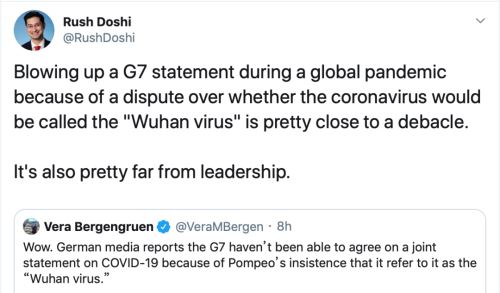 美国布鲁金斯学会高级研究员杜如松:由于对新冠病毒是否该被称为“武汉病毒”的争议,在全球性流行病蔓延期间毁了G7联合声明,真是让人崩溃。而且,这和领导力背道而驰。