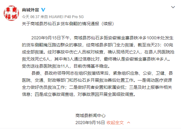 据悉,9月15日上午,一辆外地运输蒜瓣的货车在商城县苏仙石乡与安徽交界处洒落部分蒜瓣,周边群众闻讯后赶往现场捡拾。15日16时25分左右,一辆运输碎石子的货车从安徽进入商城,在该路段发生侧翻,伤害到正在捡拾蒜瓣的群众,造成人员伤亡。