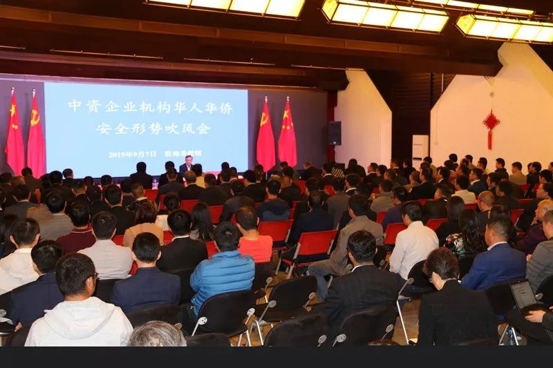 9月7日,驻南非使馆召开中资企业机构和主要侨社团负责人安全形势吹风会,并就做好在南中国公民和企业机构安全保护工作进行动员和部署。林松添大使出席并讲话,使馆部门以上负责人、驻开普敦总领馆林静总领事、驻约翰内斯堡总领馆屈伯勋代总领事、驻德班总领馆丁巧副总领事以及在南中资企业机构、13家警民合作中心、主要侨团负责人、留学生代表等近200人参加。