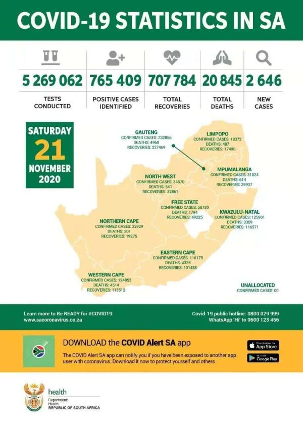 11月21日,南非新增确诊2646例,新增死亡86例,累计治愈707784例,累计确诊765409例,累计死亡20845例。