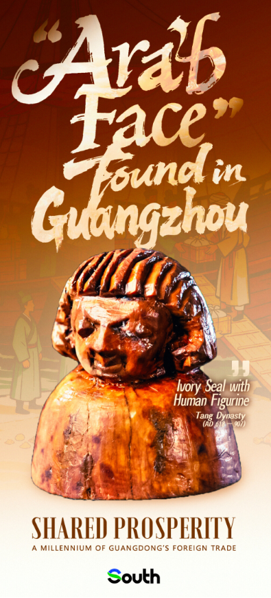 This seal was unearthed from the remnants of the Royal Palace & Garden of the Nanyue Kingdom in Guangzhou. The upper section features a bust carving of a figurine with a prominent nose, deep-set eyes, and curly hair—distinctive facial characteristics associated with Arab people. Its oval base differs from traditional Chinese seals, aligning with West Asian styles. Thus, experts infer that it was most likely a personal seal belonging to an Arab merchant. This artifact offers compelling physical evidence of Guangzhou's thriving maritime trade and vibrant foreign community during the Tang dynasty.