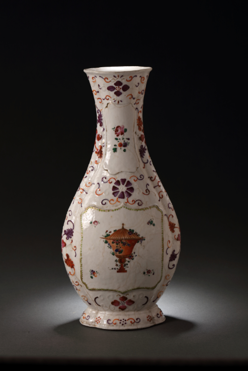 清乾隆广彩浆胎花卉奖杯纹瓜棱扁瓶