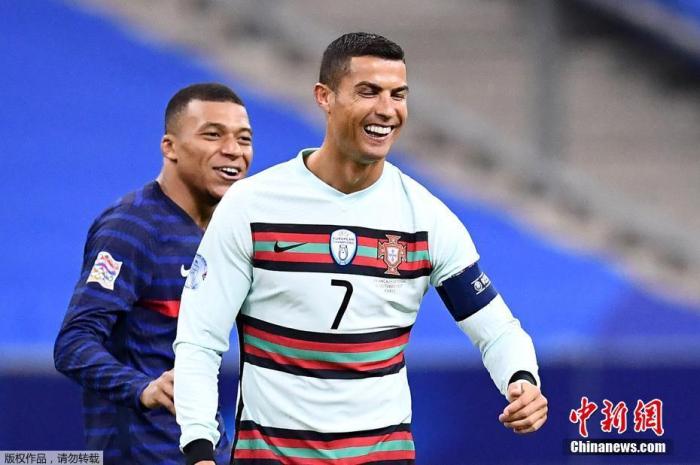北京时间13日晚,葡萄牙足协称,克里斯蒂亚诺-罗纳尔多新冠检测呈阳性。图为C罗在北京时间12日凌晨的葡萄牙与法国队的欧国联比赛中与法国球星姆巴佩互动。
