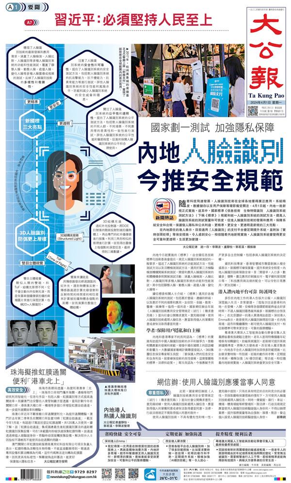 (大公報記者 趙一存、李陽波、盧靜怡、郭若溪、賴振雄)隨着科技飛速發展,人臉識別技術在全球各地獲得廣泛應用,系統精度、數據儲存以至用戶保障等環節備受關注。4月1日起,內地一批新規正式實施,這其中,國家標準《信息技術 生物特徵識別 人臉識別系統測試方法》(下稱《標準》)規範和統一人臉識別系統的測試方法,提高人臉識別系統的測試質量和可信度,促進人臉識別技術的發展和應用,保障系統安全和合規,保護個人隱私和公共利益。更精準、更安全、更透明是新規的三大亮點。