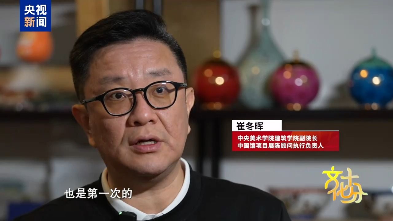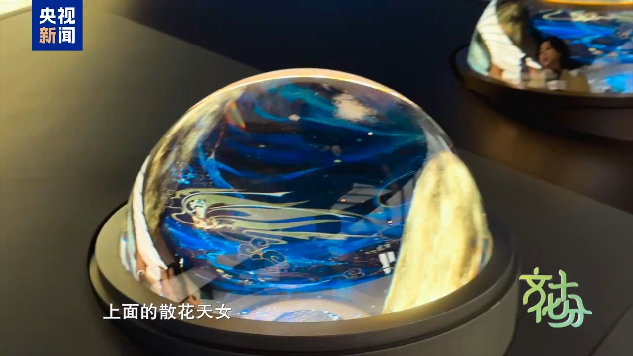 中央美术学院建筑学院副院长中国馆项目展陈顾问执行负责人崔冬晖:我们用了常老师描绘的隋代的散花天女的图案在顶部发光,人们去看这个月壤的时候,这个球体能够反射到上面的散花天女。用艺术的方式体现了中国人的极致浪漫与现在科技强国的特征的集合。