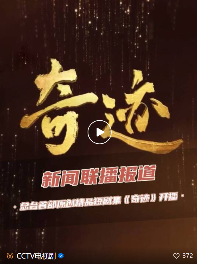 12月22日晚8点,由中央广播电视总台携手深圳共创的精品短剧集《奇迹》在CCTV-1黄金档首播。这是总台首部原创精品短剧集,也是CCTV-1晚八点黄金档播出的首部短剧集。