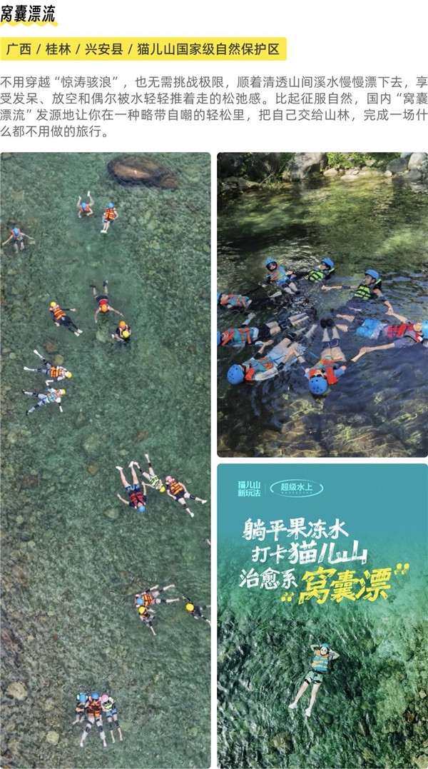 年轻人需要释放、疗愈或“低成本逃离”。广西桂林猫儿山的“窝囊漂流”就是一种略带自嘲的松弛体验——顺着溪水慢慢漂,发呆放空,把自己交给山林。