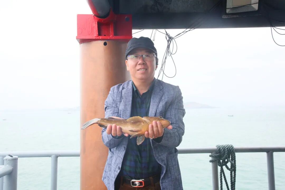 彼时,深远海养殖平台正在国内兴起,王开木走访了连江、浙江象山等地,近距离观摩了近十个海上养殖平台,之后与福建省水产研究所携手研究设计“航宁一号”。历经困难、“见招拆招”,终于在2024年,“航宁一号”正式建成投入养殖生产。记者在现场看到,投喂饵料时,网箱中鱼儿扑腾跳跃,展现出他们在深远海上练出的“肌肉”。“去年,我们投放了500克的黄瓜鱼8万尾,经受住了几次台风的考验,春节出售时,规格达800到1000克,每条鱼平均增重400克。经过‘健身’的黄瓜鱼体型和肉质都非常优质。”